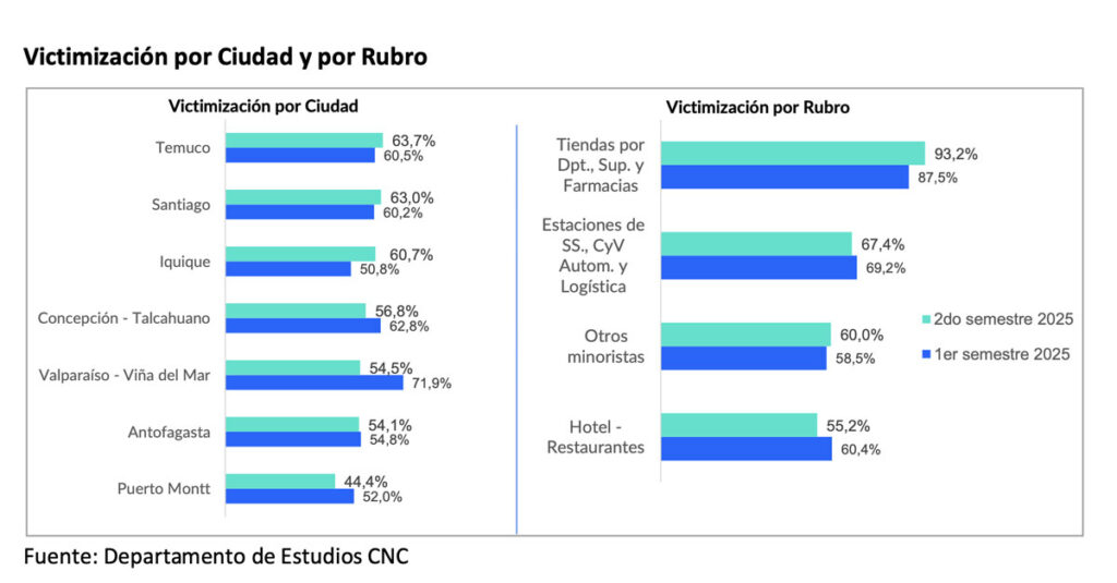 La encuesta de victimización del comercio elaborada por el Departamento de Estudios de la Cámara Nacional de Comercio, Servicios y Turismo de Chile (CNC) evidencia que, durante el segundo semestre del 2025, un 61,2% de los locales fueron víctima de algún delito, sin cambios significativos respecto a la medición anterior, evidenciando la persistencia de un problema estructural que afecta directamente el funcionamiento del sector.