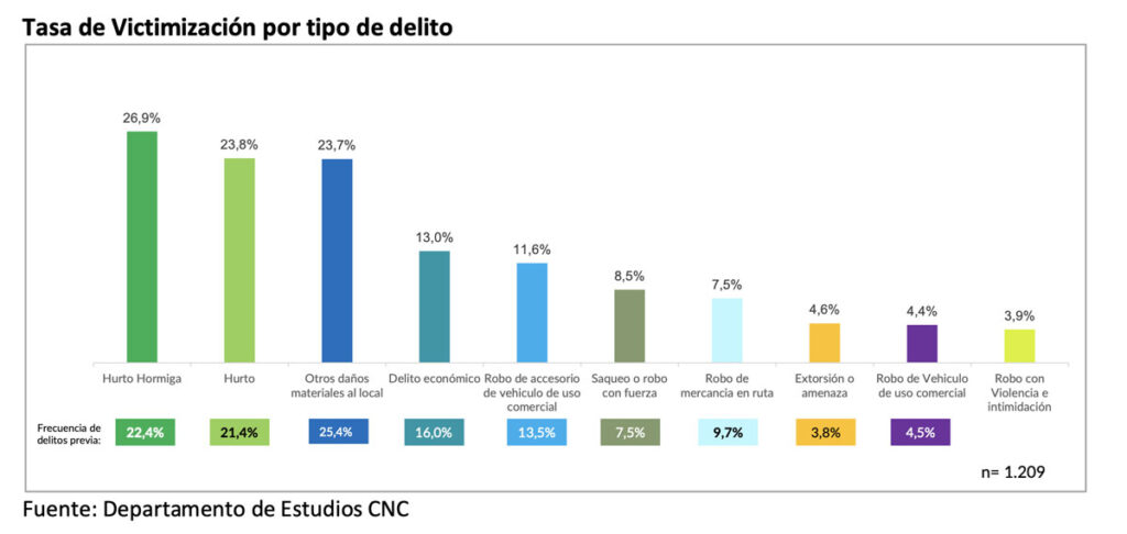 Un 23,3% de los encuestados fue víctima de hurto hormiga, le siguen hurto con 15,4%, otros daños materiales al local (17,2%), delitos económicos (12,2%). Por su parte, el robo con una connotación más violenta, que incluye el saqueo o robo con fuerza y el robo con violencia e intimidación afectó a un 7,4% de los encuestados.