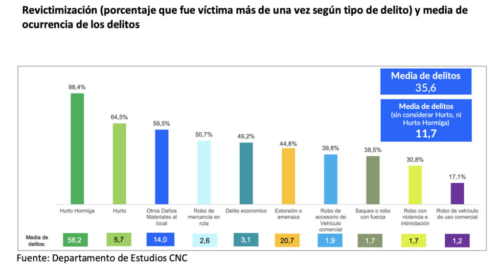 Aquellos que son víctima de delitos lo son en su mayoría más de una vez, con una media de 35,6 veces, y sin considerar el hurto y hurto hormiga la media de delitos es 11,7 veces por local victimizado, subiendo respecto a la medición anterior.