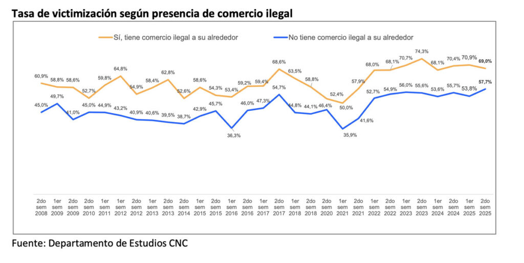 Al igual que en sondeos anteriores, esta condición tendría cierta incidencia en los niveles de victimización, ya que el 69% de los negocios que reportan presencia de comercio ilegal en las cercanías fue víctima de algún delito o falta en el segundo semestre de 2025, en línea con mediciones anteriores y en cuanto a los que no tienen comercio ambulante a su alrededor, un 57,7% fueron víctima de algún delito, aumentando significativamente este ítem frente a mediciones anteriores.