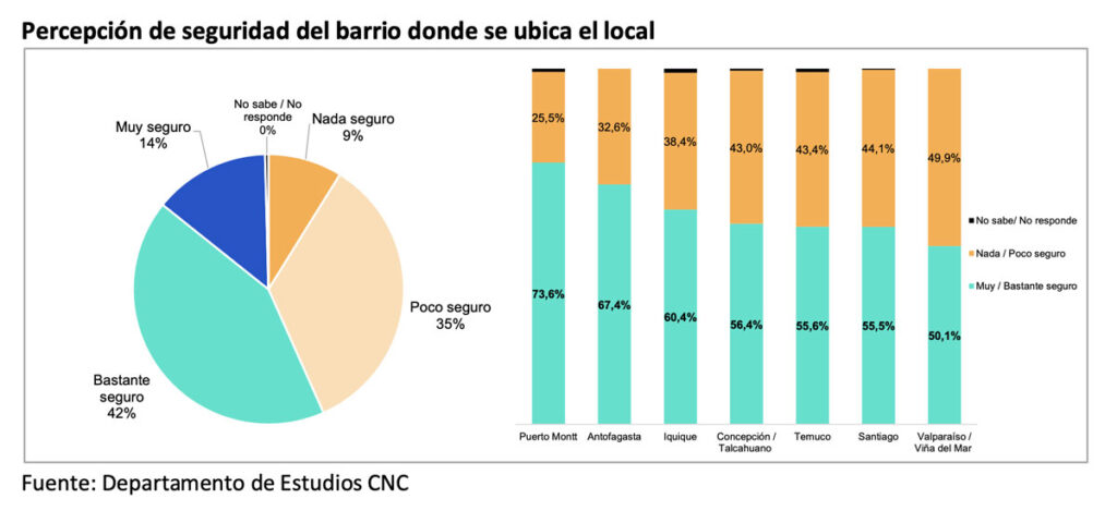 En términos regionales, todas las ciudades encuestadas evidenciaron bajas significativas en la percepción de inseguridad comparado con la medición anterior. Las ciudades con mayores niveles de inseguridad son Valparaíso-Viña del Mar con 49,9% y Santiago donde un 44,1% de los encuestados menciona que el lugar donde se ubica su negocio es poco o nada seguro.
