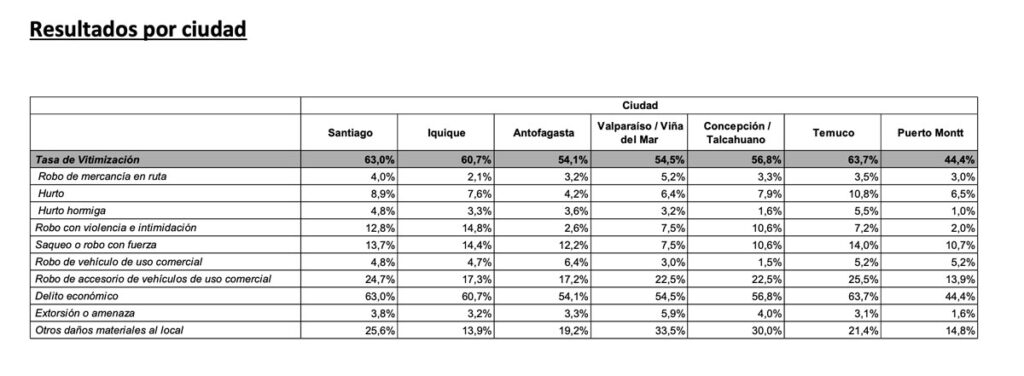 El sondeo que se realizó entre el 7 de enero hasta el 2 de marzo del 2026 a 1.209 establecimientos de Iquique, Antofagasta, Viña del Mar-Valparaíso, Gran Santiago, Concepción-Talcahuano, Temuco y Puerto Montt, da cuenta de una tasa de victimización de 61,2% resultado en el que no se aprecian cambios significativos respecto a la medición anterior en términos generales, pero si se ven diferencias en las capitales regionales evaluadas. Se aprecia una baja significativa en Valparaíso-Viña del Mar, Concepción-Talcahuano y Puerto Montt respecto a la medición anterior y un aumento significativo en Iquique.
